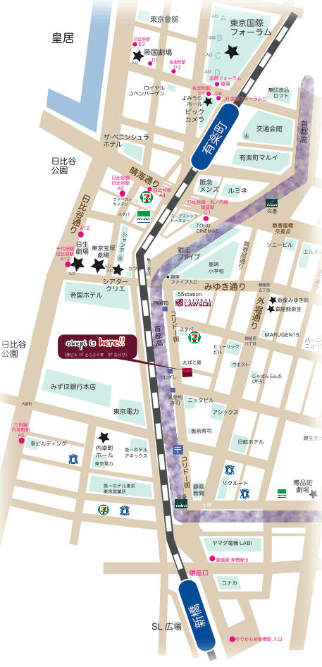 (地下鉄日比谷駅・銀座駅より徒歩3分。JR有楽町駅・新橋駅より徒歩5分)